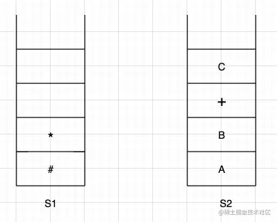 S1暂存运算符,但是要保证越到栈顶,运算符优先级越高,然后把数字元素放在S2中。