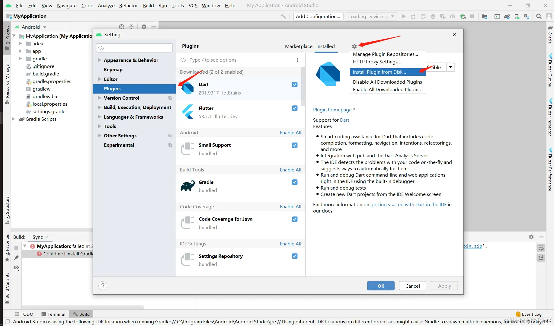 android studio 没有安装flutter插件和dart插件,需要安装对应的插件,按官网提示操作有坑 后续我会详细讲解