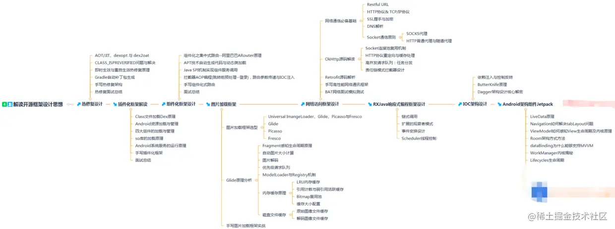 在Android开发中开源框架设计思想中的知识点也是较为重要的,相信大家都可以看到在每个公司招聘当中,对Android开源框架要求都是比较严谨的。而想要完全搞懂还得学会整理和规划:我们常见的Android热修复框架、 插件化框架、 组件化框架、 图片加载框架、 网络访问框架、 RxJava响应式编程框架 , IOC依赖注入框架、最近架构组件Jetpack等等Android第三方开源框架,这些都是属于Android开源框架设计思想的。如下图所示: