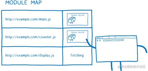 一旦module record被创建,它将被放入模块映射中module map,这就意味着无论何时从此处请求,加载程序都可以直接返回map中的缓存。