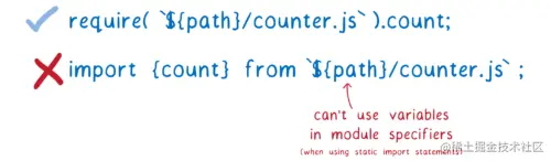 但是在ES modules中,你需要先建立整个模块图,然后再进行执行。这就说明你不能使用任何变量作为模块标识符,因为代码没有执行,变量的值没有确定。