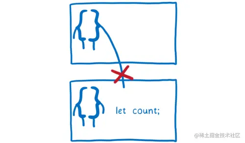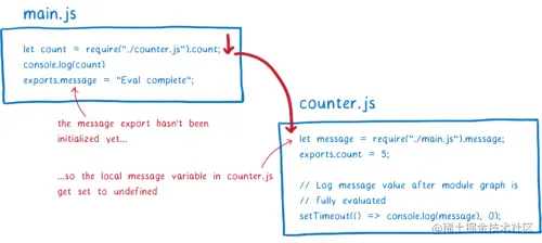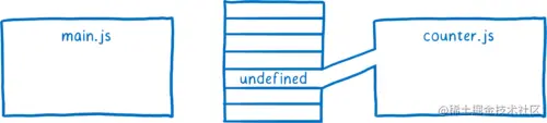 这个counter.js模块将试图获取message变量从导出的对象中,但是由于此时还没有执行main.js模块,它将返回undefined,然后JS引擎将在内存中为局部变量分配空间,并将其值设置为undefined