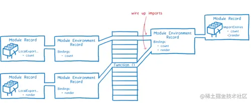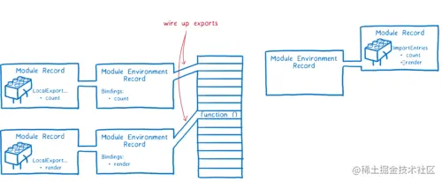 请注意,export 和 import 都指向内存中的同一个区域。先连接 export ,保证了所有的 export 都可以被连接到对应的 import 上。