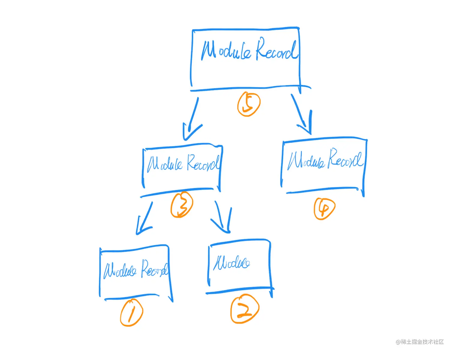 为了实例化Module Record, JS引擎采用Depth First Post-order Traveral深度优先后序进行遍历, JS引擎将会为每一个Module record 创建一个 Module environment record模块环境上下文。