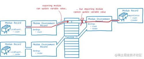 和CommonJS相反, ES模块使用动态绑定(Live Bindings),两个模块都指向内存的同一个位置,这就意味着当导出值的模块中修改值的时候,在导入的模块中能够立马呈现。(导入变量的模块无法修改导入的值,如果导入的是对象类型,那么可以修改其属性值)