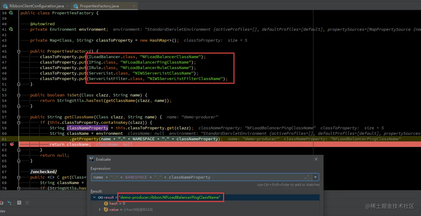 进入到 DefaultClientConfigImpl,可以看到 CommonClientConfigKey 中的每个配置都对应了一个默认值。在加载配置的时候,如果用户没有定制配置,就会使用默认的配置。