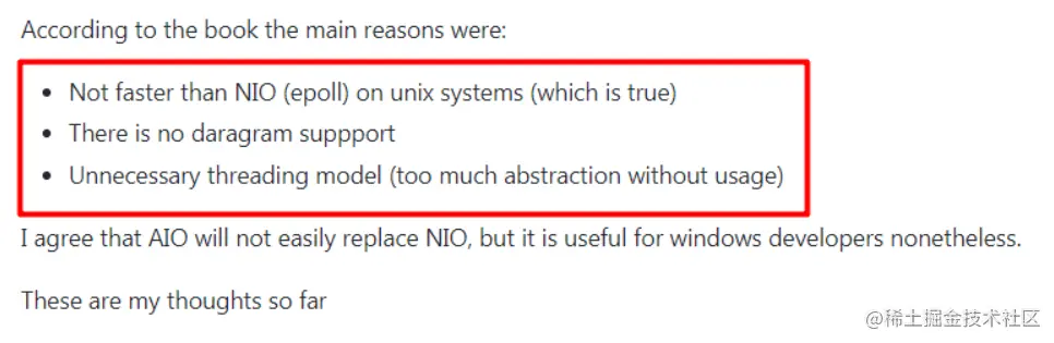 - Netty整体架构是reactor模型, 而AIO是proactor模型, 混合在一起会非常混乱,把AIO也改造成reactor模型看起来是把epoll绕个弯又绕回来