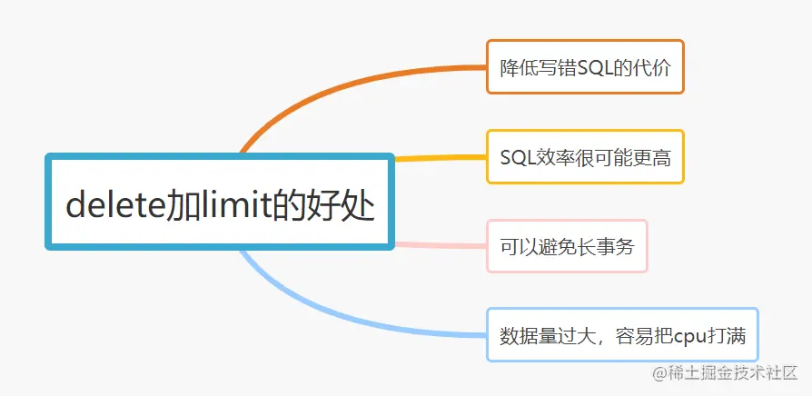 - 「数据量大的话,容易把CPU打满」 ,如果你删除数据量很大时,不加 limit限制一下记录数,容易把cpu打满,导致越删越慢的。