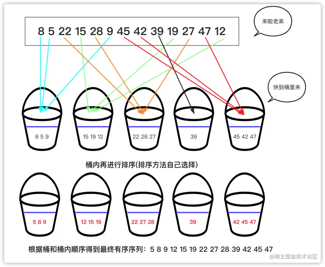 - 桶:若干个桶,说明此类排序将数据放入若干个桶中。