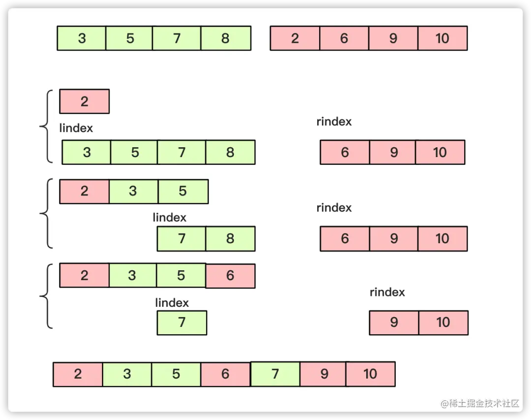 while (lindex<=mid&&rindex<=r) {//先左右比较合并