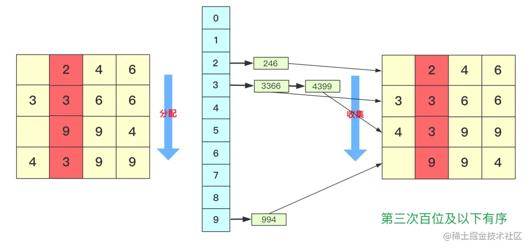 而第三次就是对百位进行分配收集,此次完成之后百位及其以下是有序的。