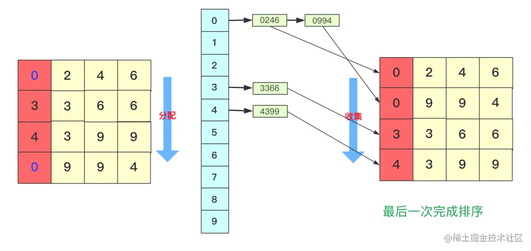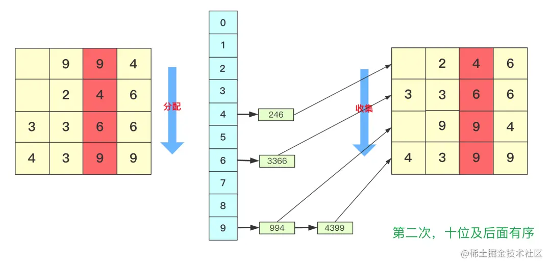 分配和收集都是有序的,第二次会根据十位进行分配、收集,此次是在第一次个位分配、收集基础上进行的,所以所有数字单看个位十位是有序的。