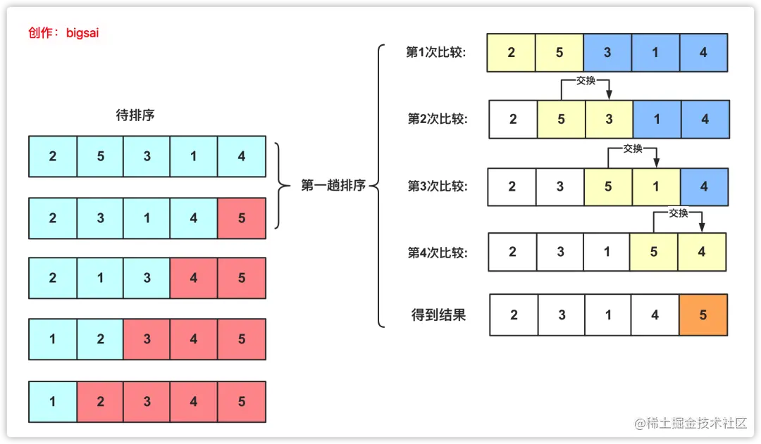 - 从第一个元素开始往后遍历,每到一个位置判断是否比后面的元素大,如果比后面元素大,那么就交换两者大小,然后继续向后,这样的话进行一轮之后就可以保证**「最大的那个数被交换交换到最末的位置可以确定」**。
