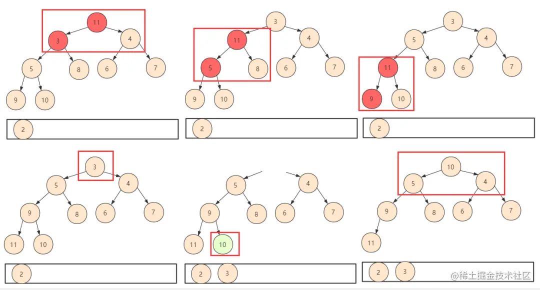 ①从第一个非叶子节点开始判断交换下移(shiftDown),使得当前节点和子孩子能够保持堆的性质