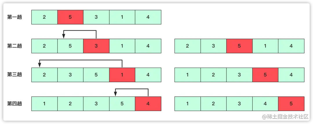 例如2 5 3 1 4排序过程如下:
