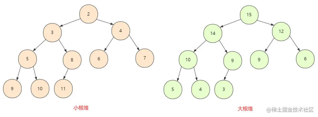 - 如果所有节点**「小于」孩子节点值,那么这个堆叫做「小根堆」**,堆的最小值在根节点。
