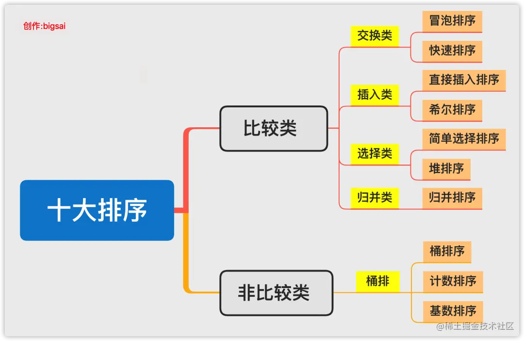 - 比较类排序也有更细致的分法,有基于交换的、基于插入的、基于选择的、基于归并的,更细致的可以看下面的脑图。