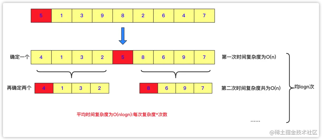 快速排序是对冒泡排序的一种改进,采用递归分治的方法进行求解。而快排相比冒泡是一种不稳定排序,时间复杂度最坏是O(n^2),平均时间复杂度为O(nlogn),最好情况的时间复杂度为O(nlogn)。