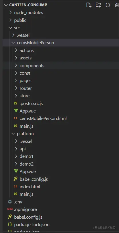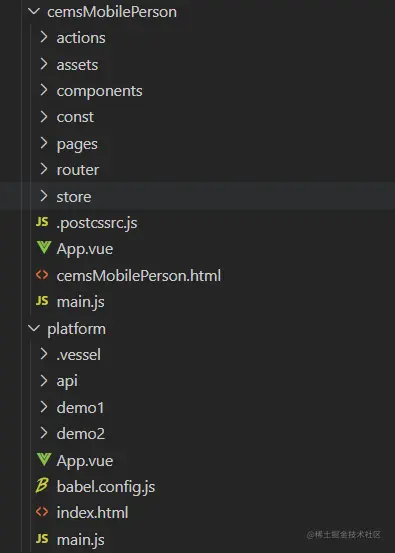 我们将web端的项目整理放到platform,包括api,store,router等,然后新建cemsMobilePerson文件,里面也是一个完整的项目结构,包括api,router,store等。