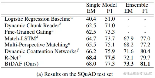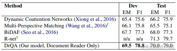 - F1: 答案和预测都看成是一个token bag,计算预测和每个正确答案的F1,选择最大的,最后在整个数据集的问题上求平均。
