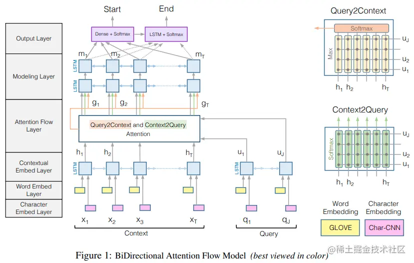 通过GloVe获取每个word的word embedding;将character和word embedding拼接传递给two-layer Highway Network。分别为context和query生成矩阵和.