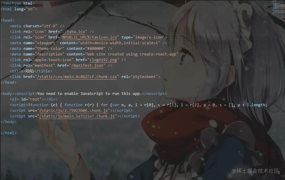 react修改网站图标和标题 react初学者 2021-02-25 2,627 阅读1分钟 1.先将项目打包 2.在build文件中找到index.html文件 3. 找到《link rel="ico" href="./haha.ico"》然后替换成自己需要的ico格式图片 4.在title标签中修改自己需要的网站标题 5.修改之后的效果