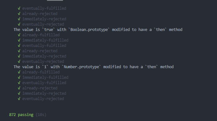最后通过promises-aplus-tests这个测试工具进行测试,结果表明:通过872个用例,符合Promise A+规范!