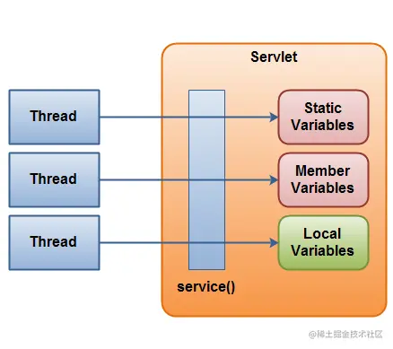 service()方法不应该访问任何成员变量,除非这些成员变量本身是线程安全的。 -