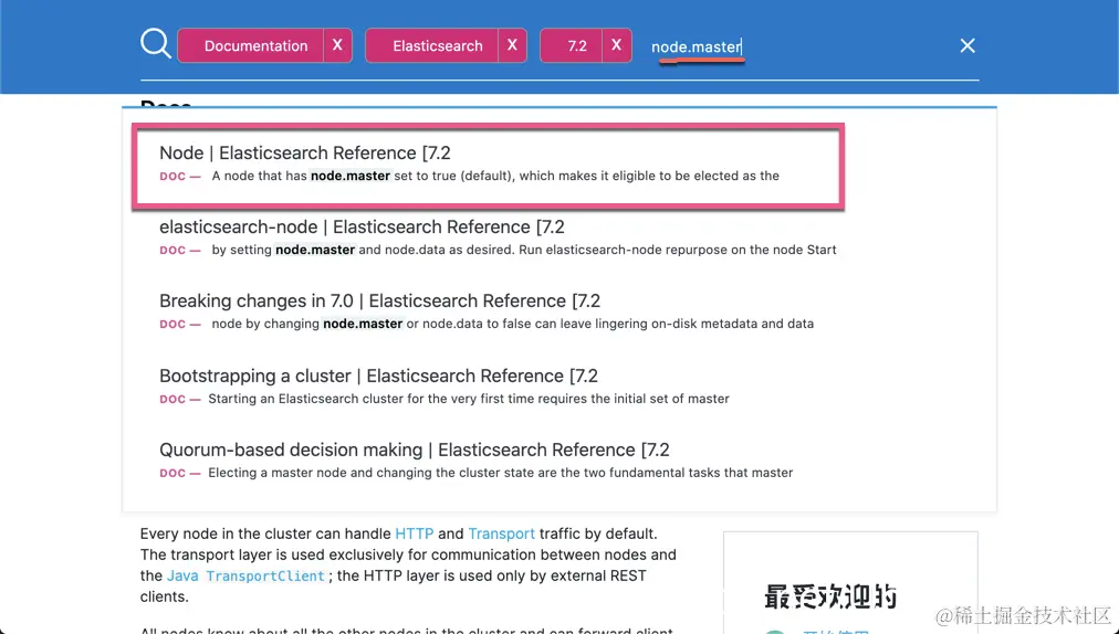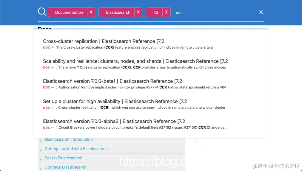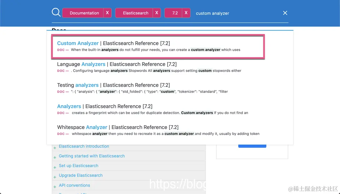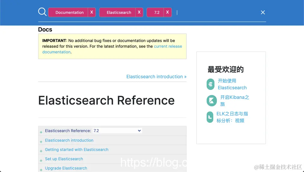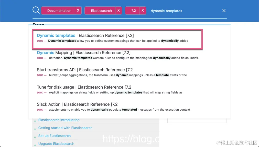 在上面,我们选定 7.2 版本,同时,我们也选定 Elasticsearch Reference。我个人觉得比较好,这样搜索时是专门针对 Elasticsearch Reference 来进行搜索的,而不是整个网站的搜索。否则我们可以看到很多 blog 相关的内容,而且它们的排名比较靠前。这样当我们点击右上角的搜索按钮时: