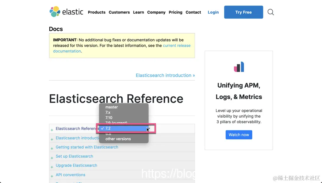 由于考试涉及的面还是蛮广的,我们有时也记不住所有的那些配置和命令。经过我的探索,我觉得最终的是你要记清楚一下关键词来通过 Elastic 的官方文档来进行搜索。首先,我们要知道 Elastic 认证考试的版本。因为每一个版本的文档的格式是不一样的,建议大家在练习时使用需要考试版本的文档来练习。比如 ECE 考试要求的是 7.2 版本: