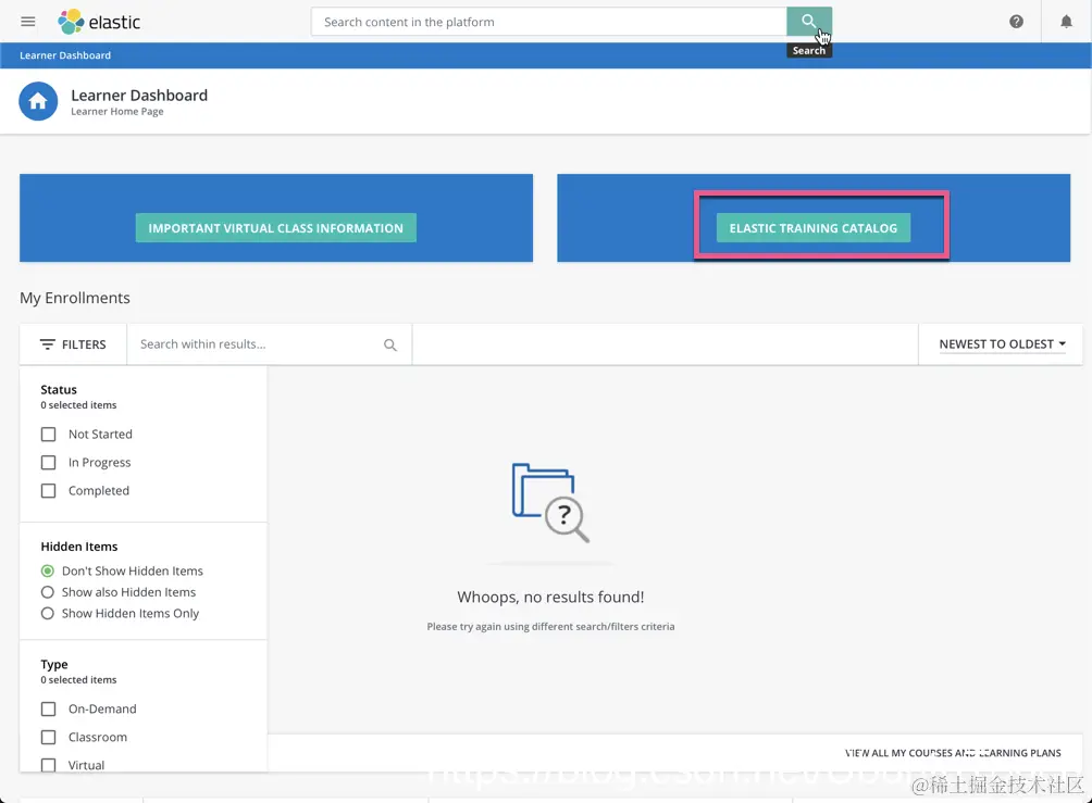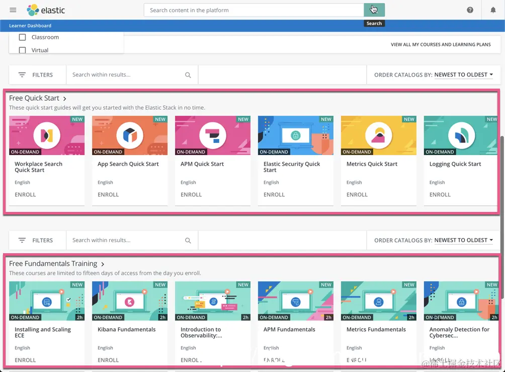 我们可以点击上面的 Elastic Training Catalog 来查看想要的课程。我们接着向下滚动屏幕: