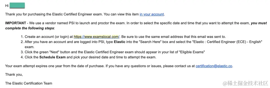 当你成功地购买 Elastic 认证考试后,你将收到一封标题为 “Elastic Certified Engineer Registration Successful! ” 的邮件。如果你没有收到的话,请检查你的垃圾邮件信箱,并寻找