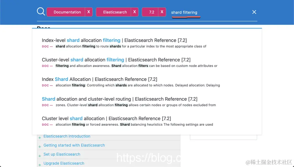 我们只需要打入相应的关键词,你就很快可以定位到相应的文档,并进行查询。上面显示的是 shard filtering 的文档链接。同样我们可以输入 shard awareness: