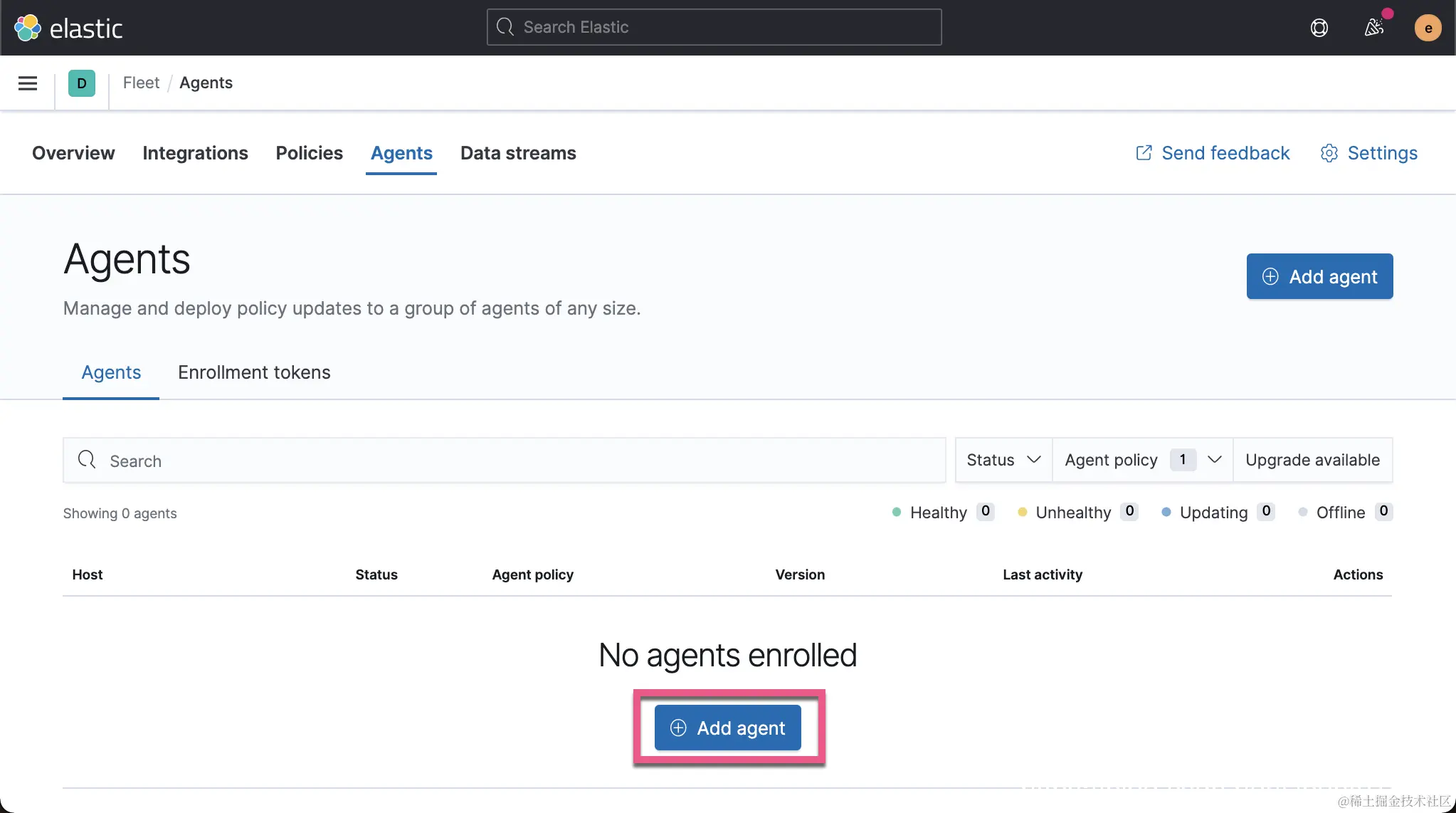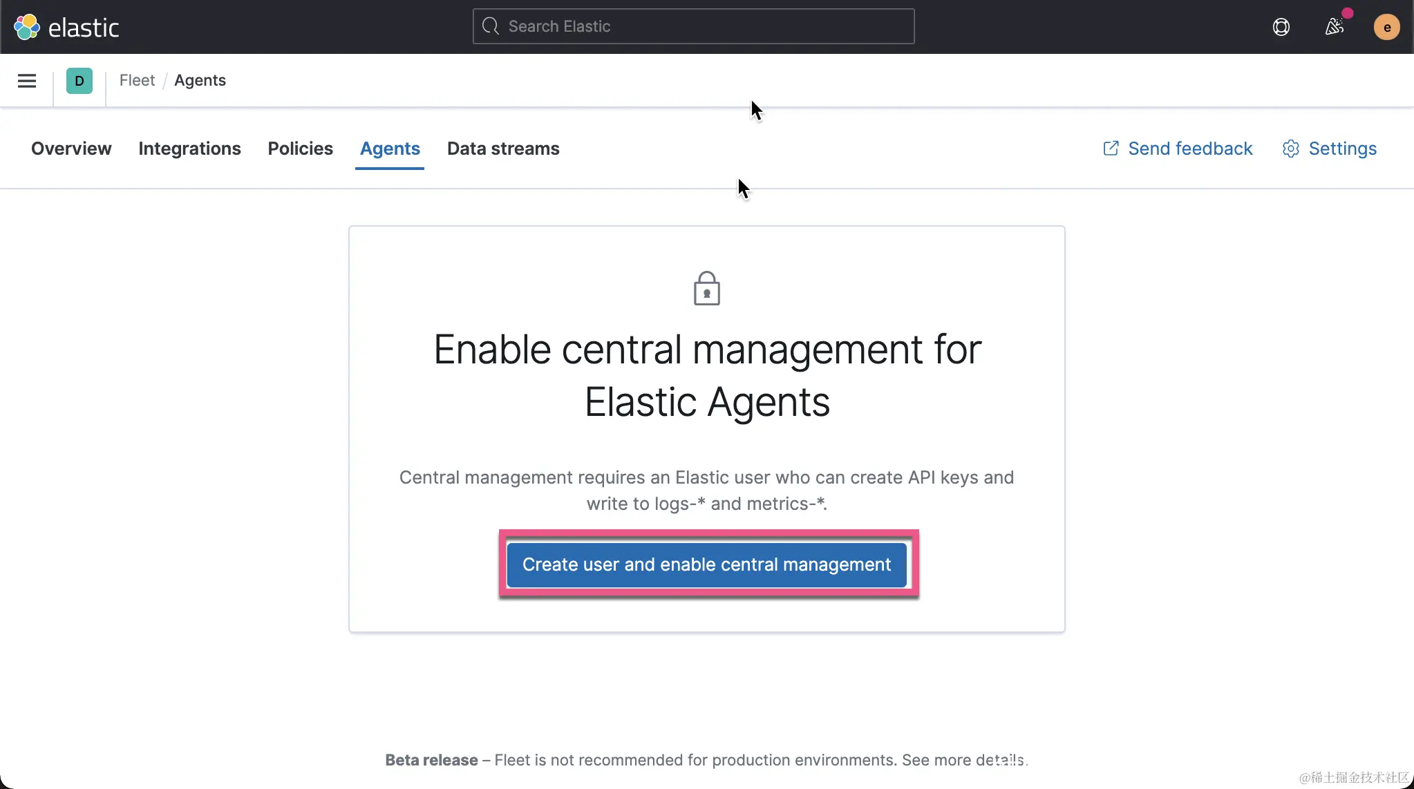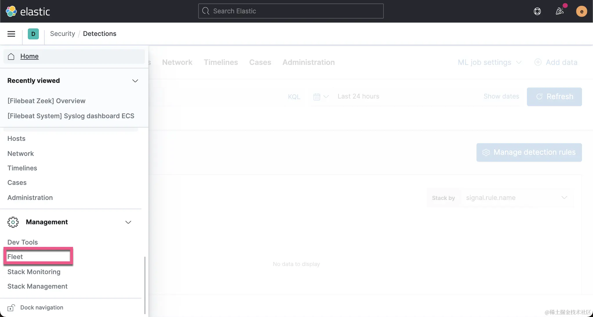 现在,我们准备安装 Elastic endpoint。首先,通过单击侧面菜单上管理标签下的链接,导航到 “Fleet” 仪表板。