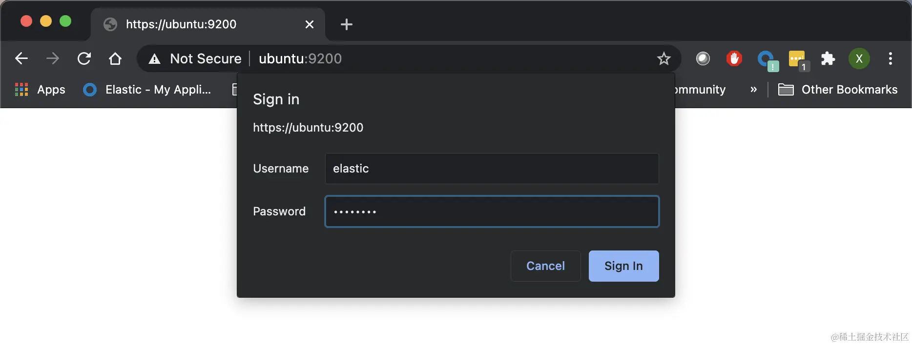 我们可以通过另外一个机器来访问 ubuntu 机器 https://ubuntu.9200。当 Chrome 浏览器上出现如下的画面时:
