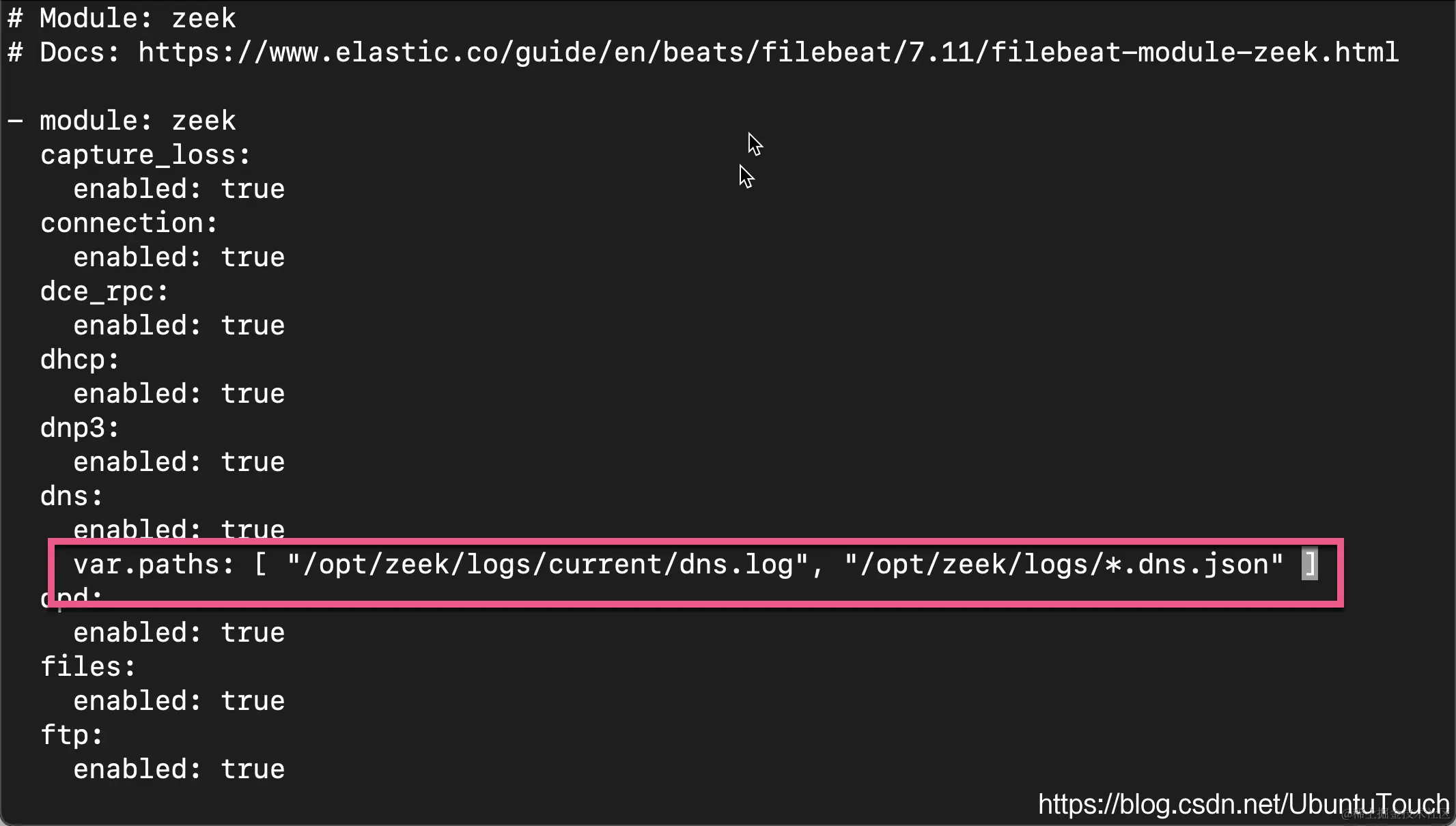 那么我们的 /etc/filebeat/modules.d/zeek.yml 最终格式为: