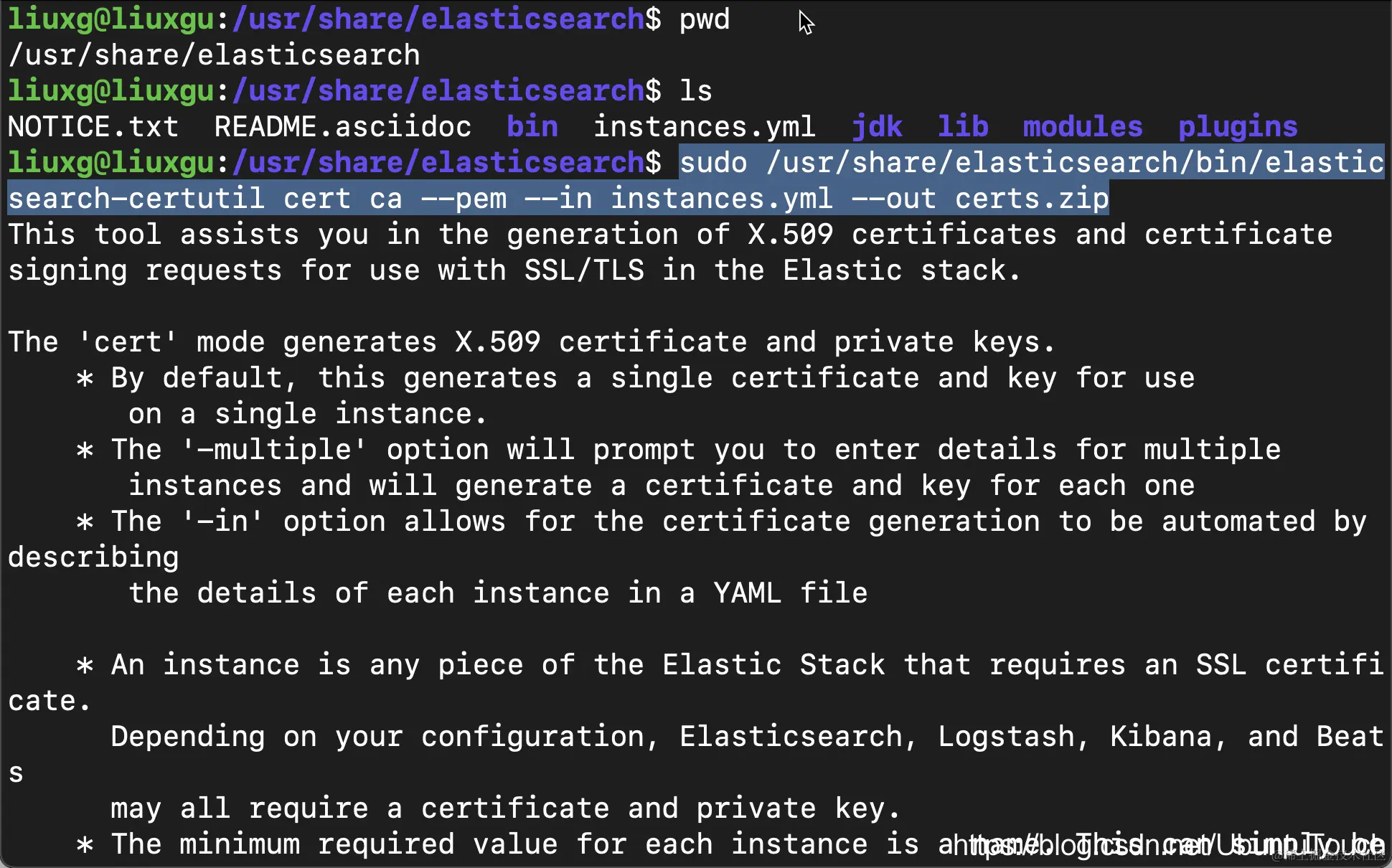 /usr/share/elasticsearch/bin/elasticsearch-certutil cert ca --pem --in instances.yml --out certs.zip