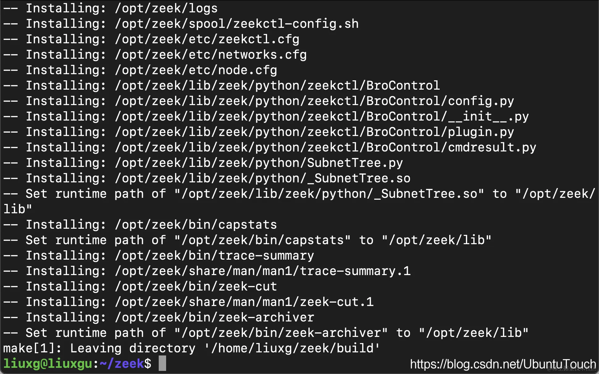 在上面,我们假设你把 zeek 的文件 clone 到 home 目录下的 zeek 目录。现在,我们准备安装 Zeek,运行以下 make 命令,然后将其保留安装(这可能需要一些时间)