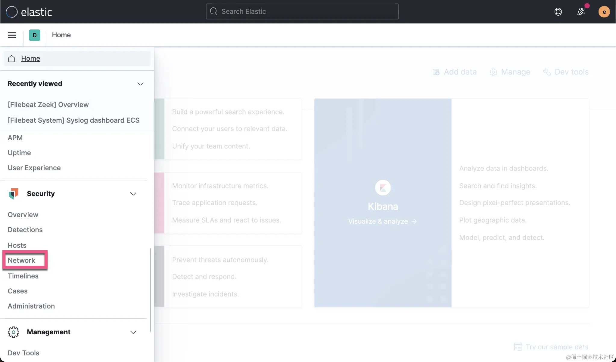 我们可以通过 Filebeat 把 Zeek 的日志信息导入到 Elasticsearch 中去。首先,我们必须启动 zeek 模块。我们打开 Kibana 的界面: