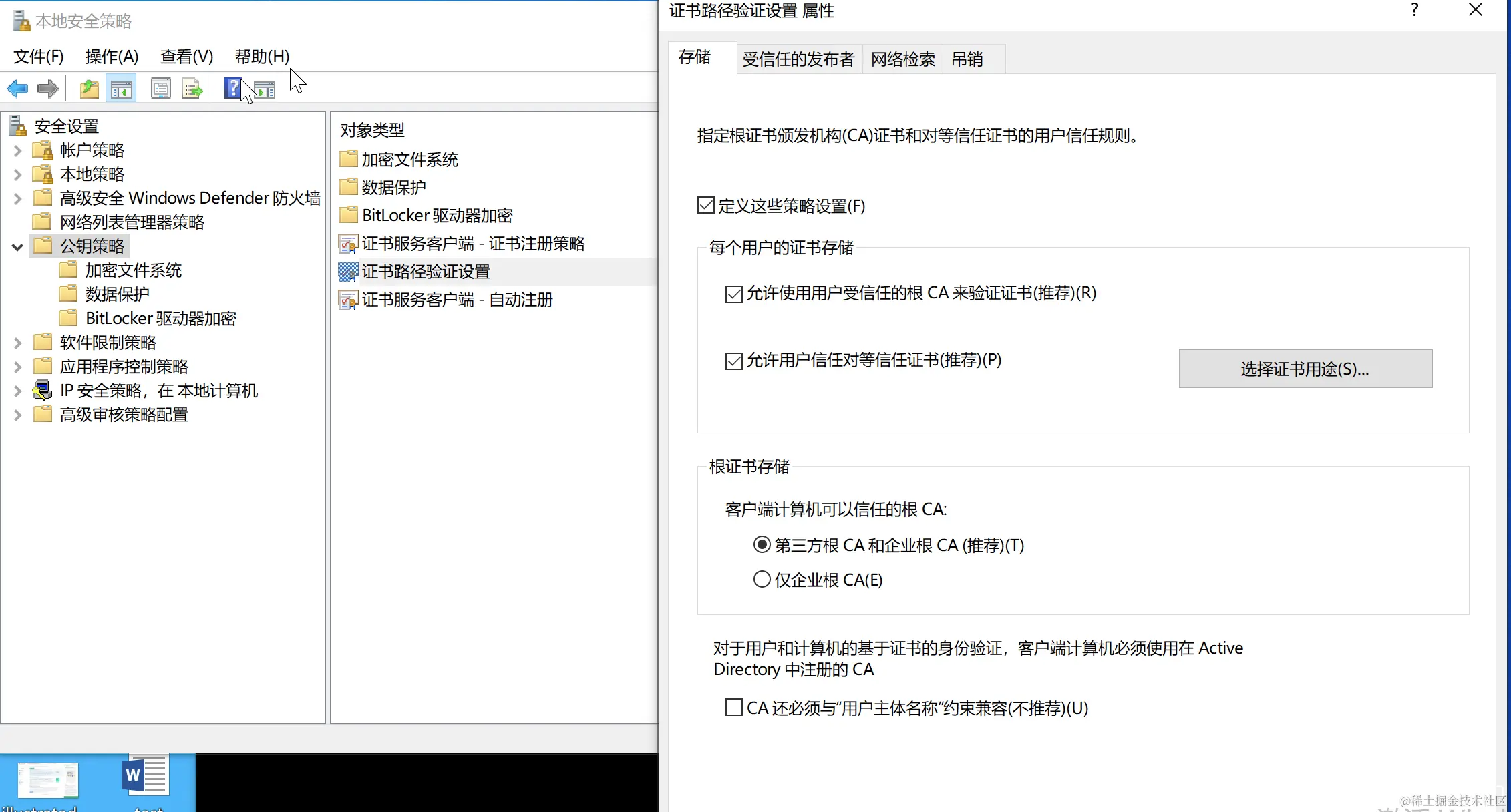 首先在 Windows 搜索栏中搜索 “本地安全策略”。 然后转到 安全设置 > 公钥策略 > 证书路径验证设置