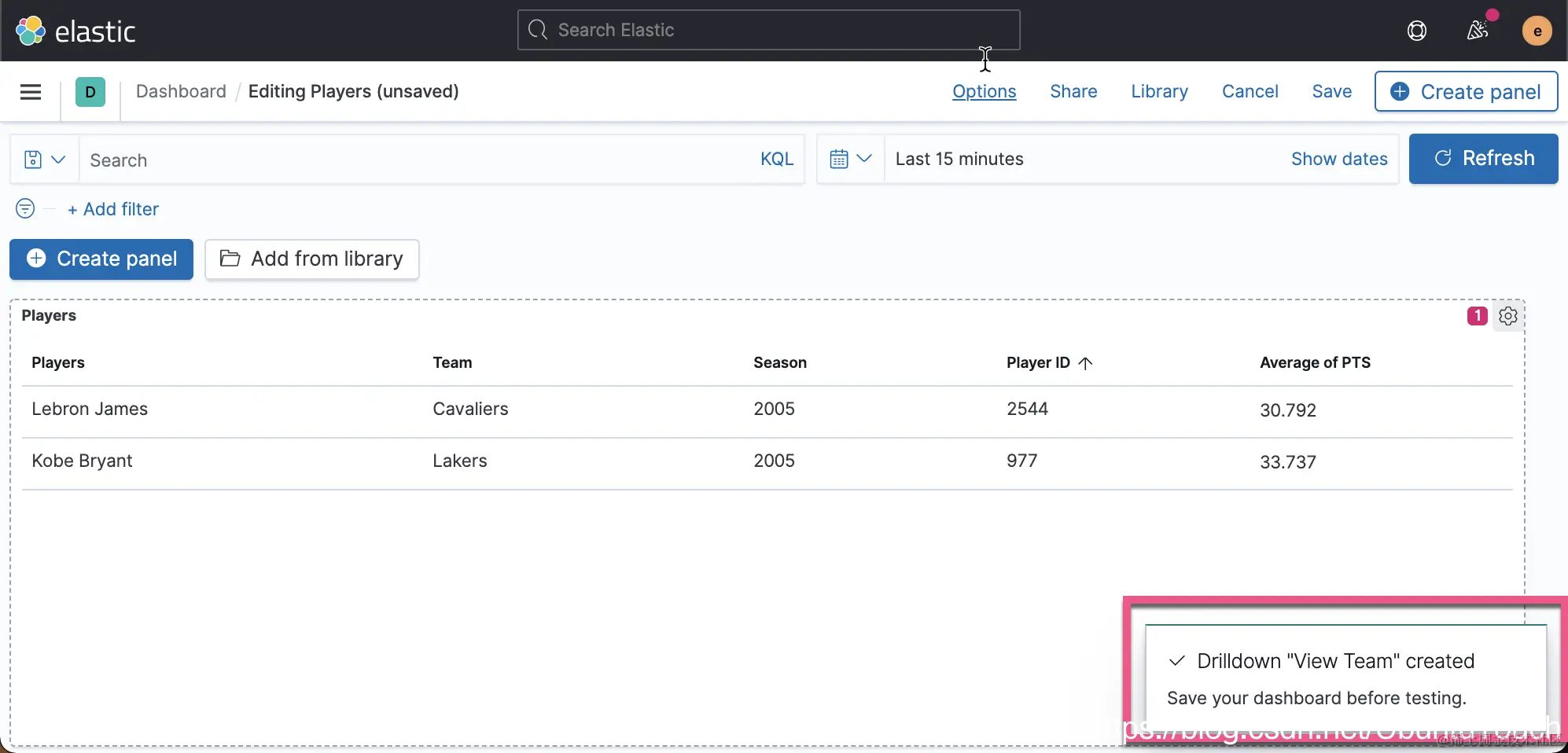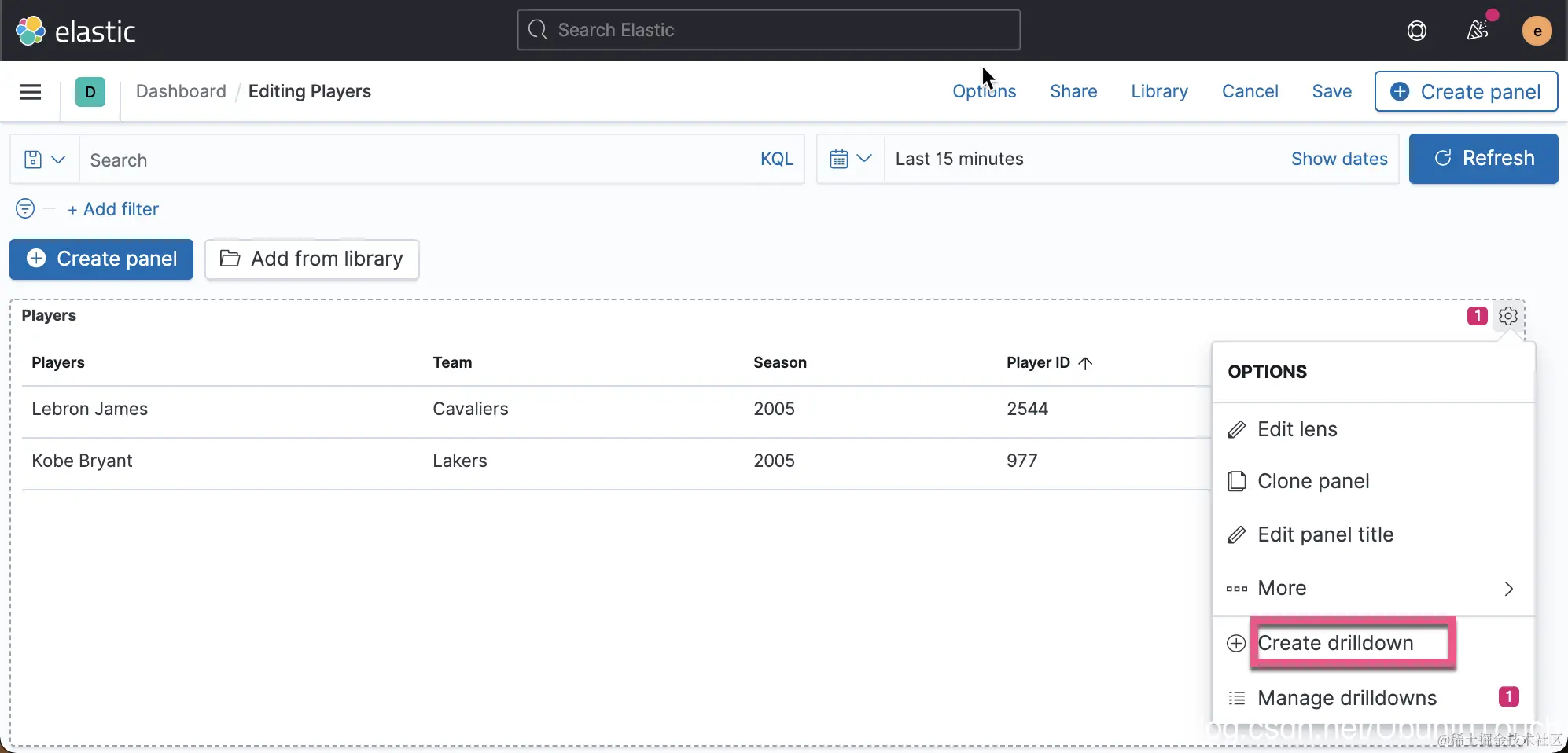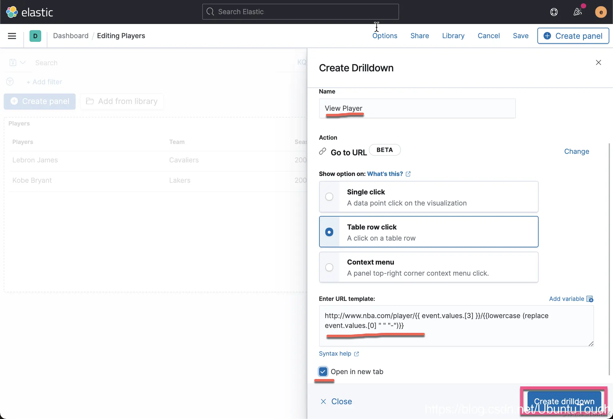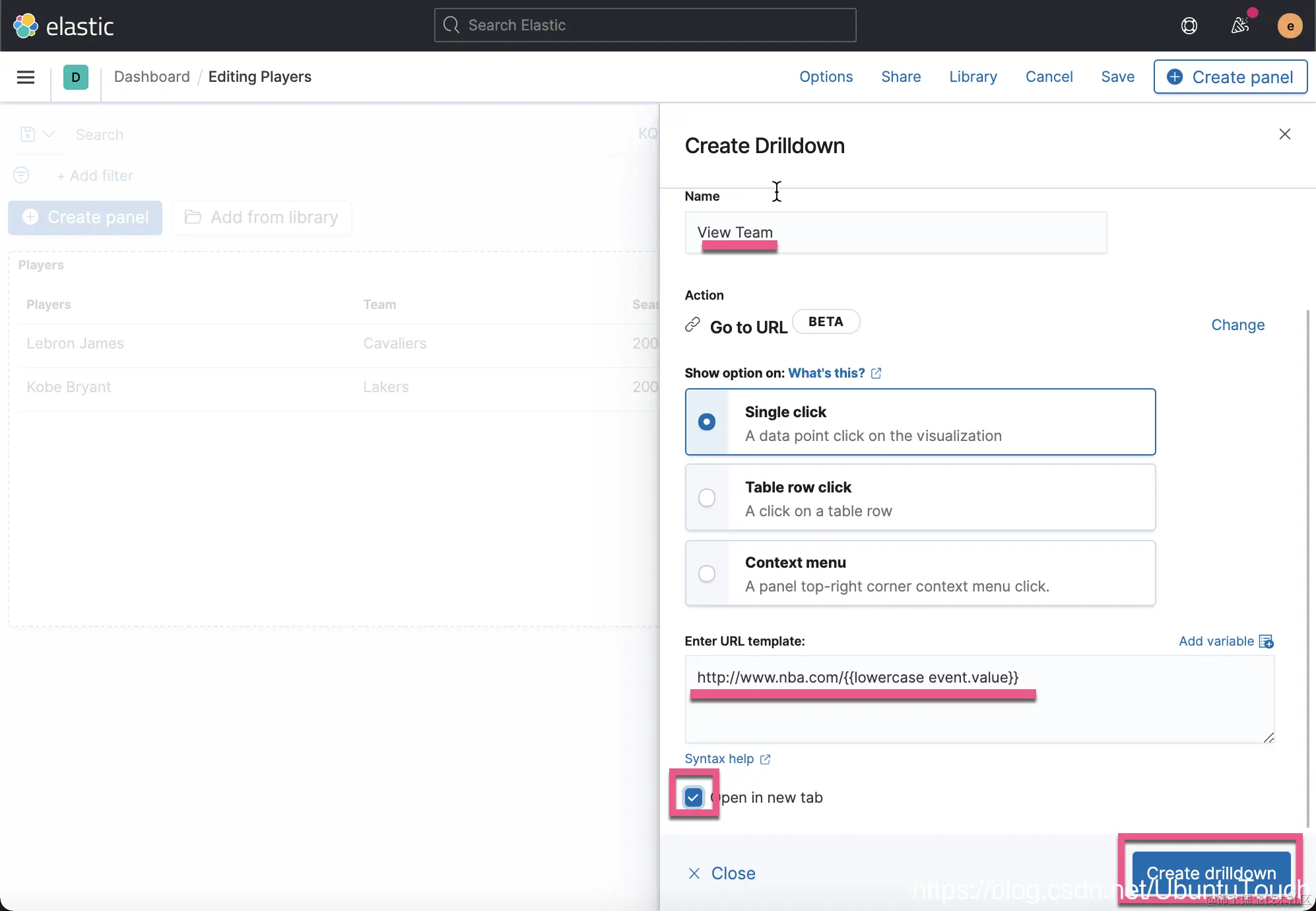 在上面,我们使用 lowercase 把点击的值变为小写,以传入 NBA 的网页中进行查询。点击 Create drilldown: