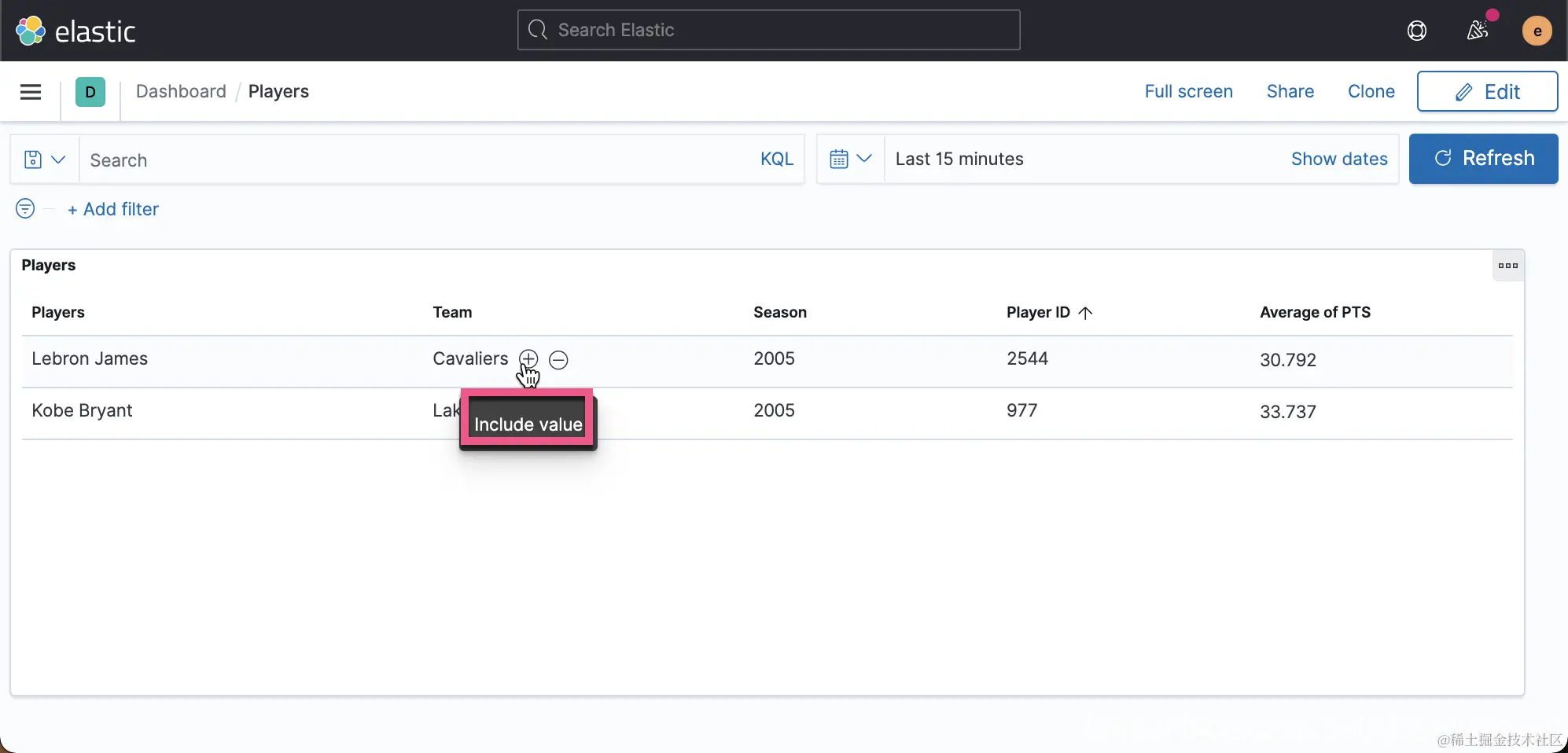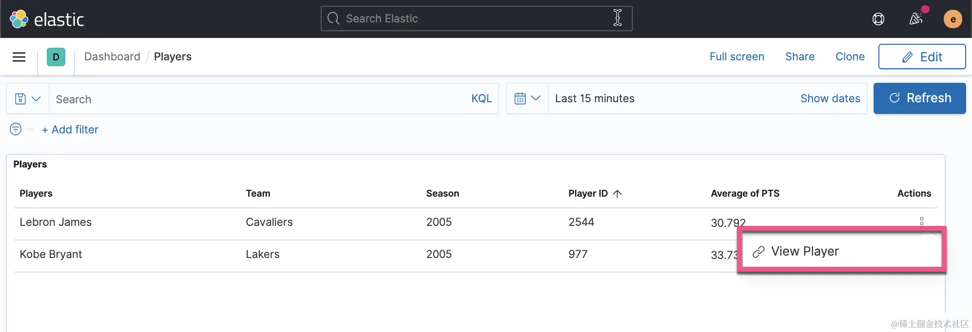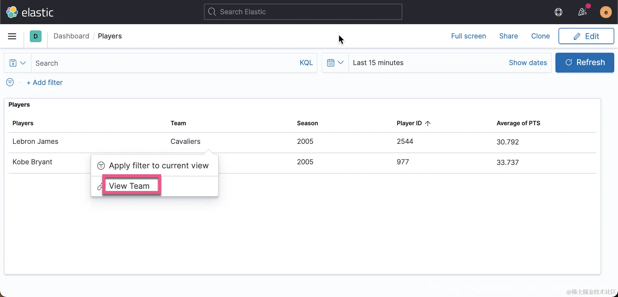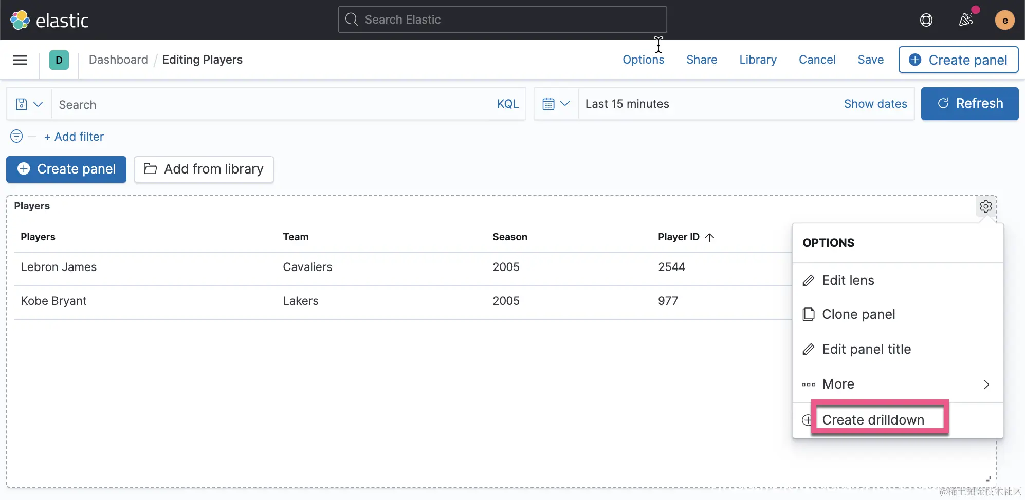 在上面,我们使用 lowercase 把点击的值变为小写,以传入 NBA 的网页中进行查询。点击 Create drilldown: