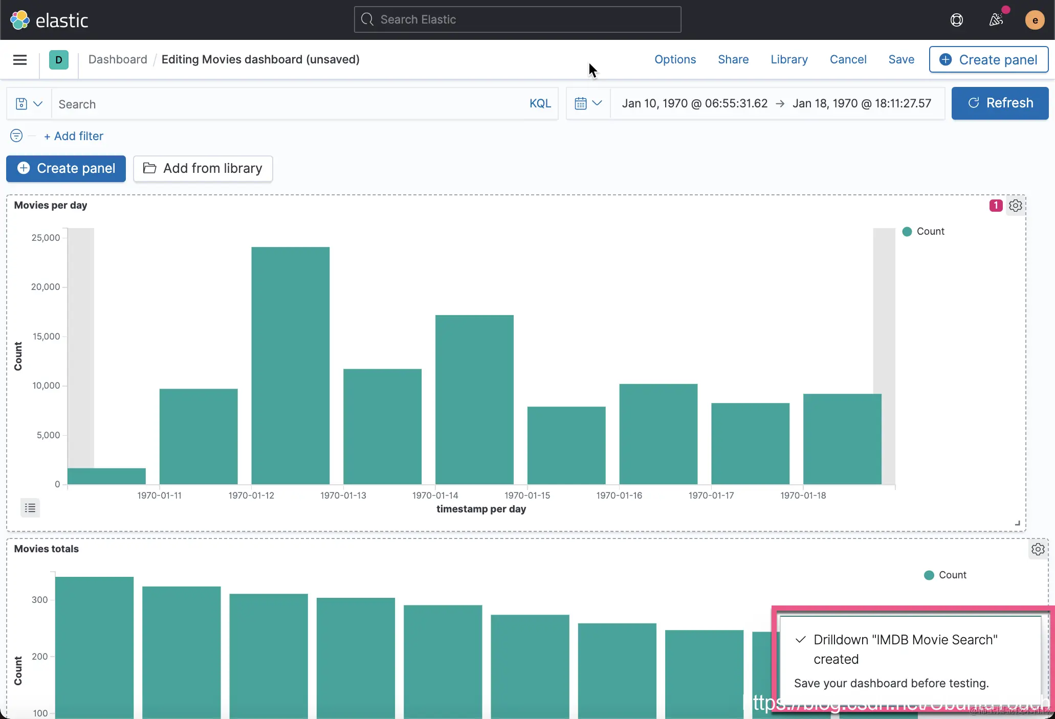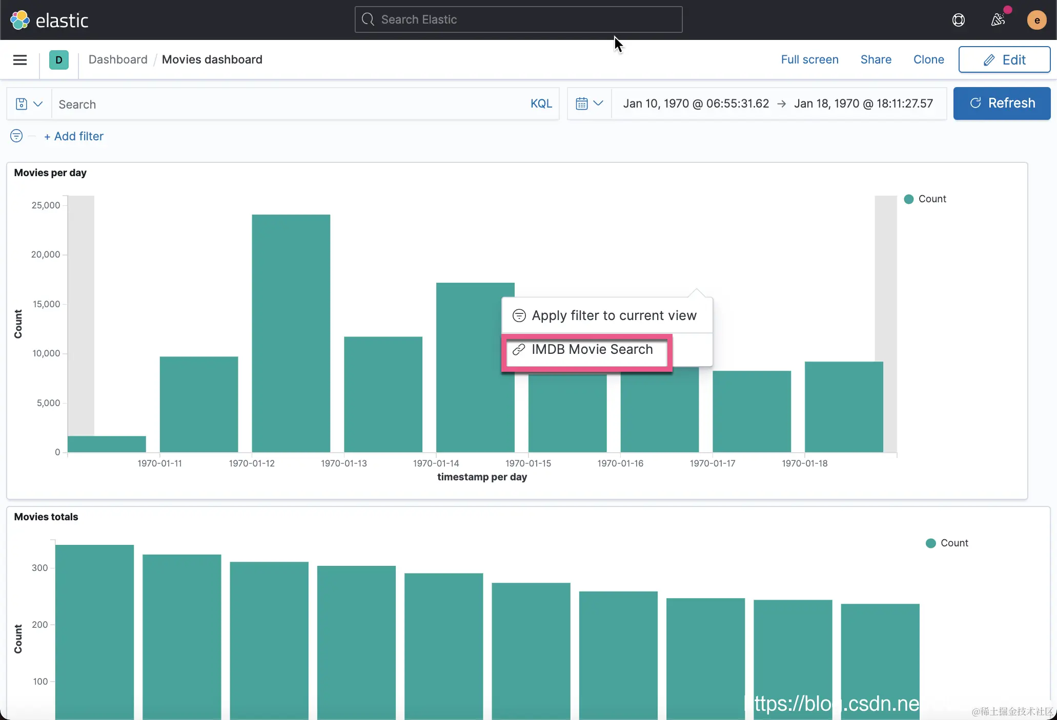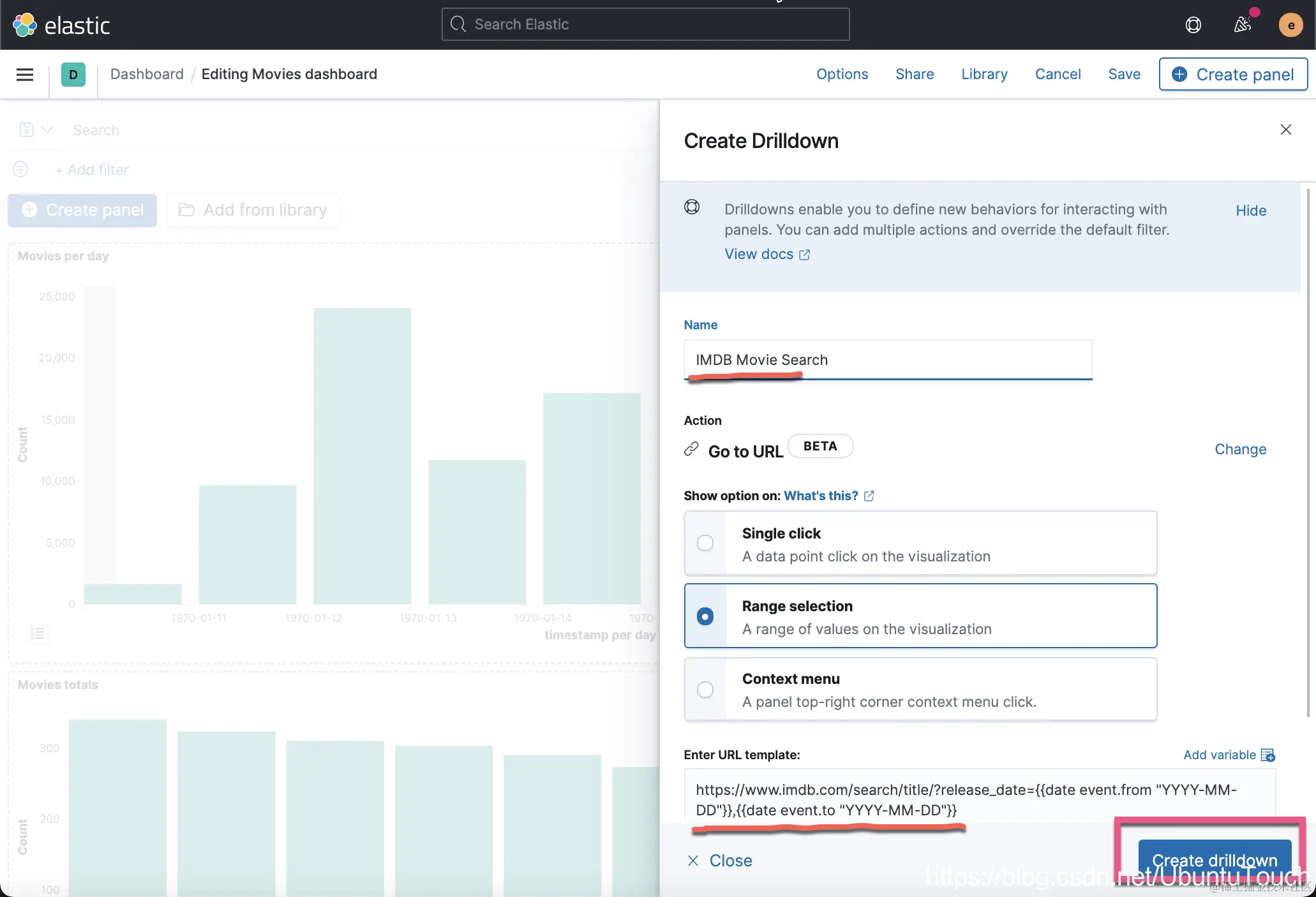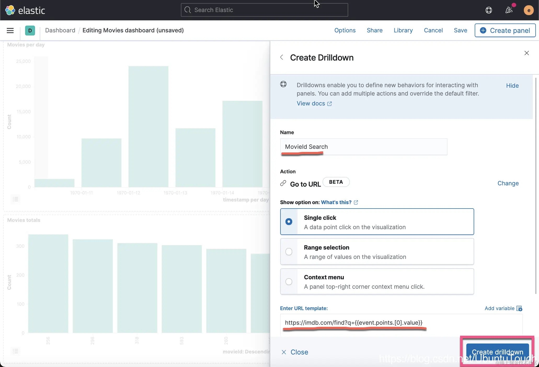 在上面的第一个可视化中,我们想针对可视化的时间范围来进行 drilldown,也就是说我们想针对 imdb 在可视化显示的时间段里进行搜索。我们可以通过如下的方法来进行操作。