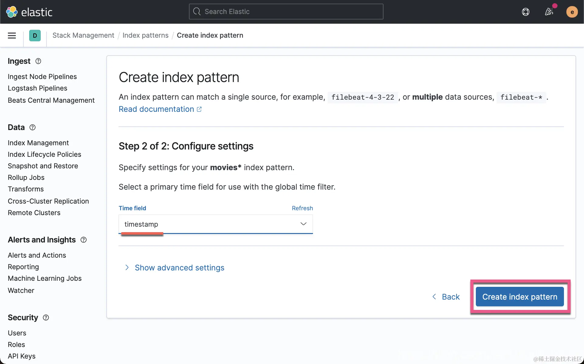 请注意在上面,我们需要修改 timestamp 的 type 为 date。我们点击 Import 按钮。我们接下来为 movies 索引创建一个 index pattern: