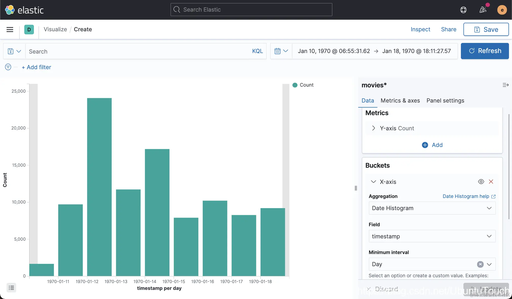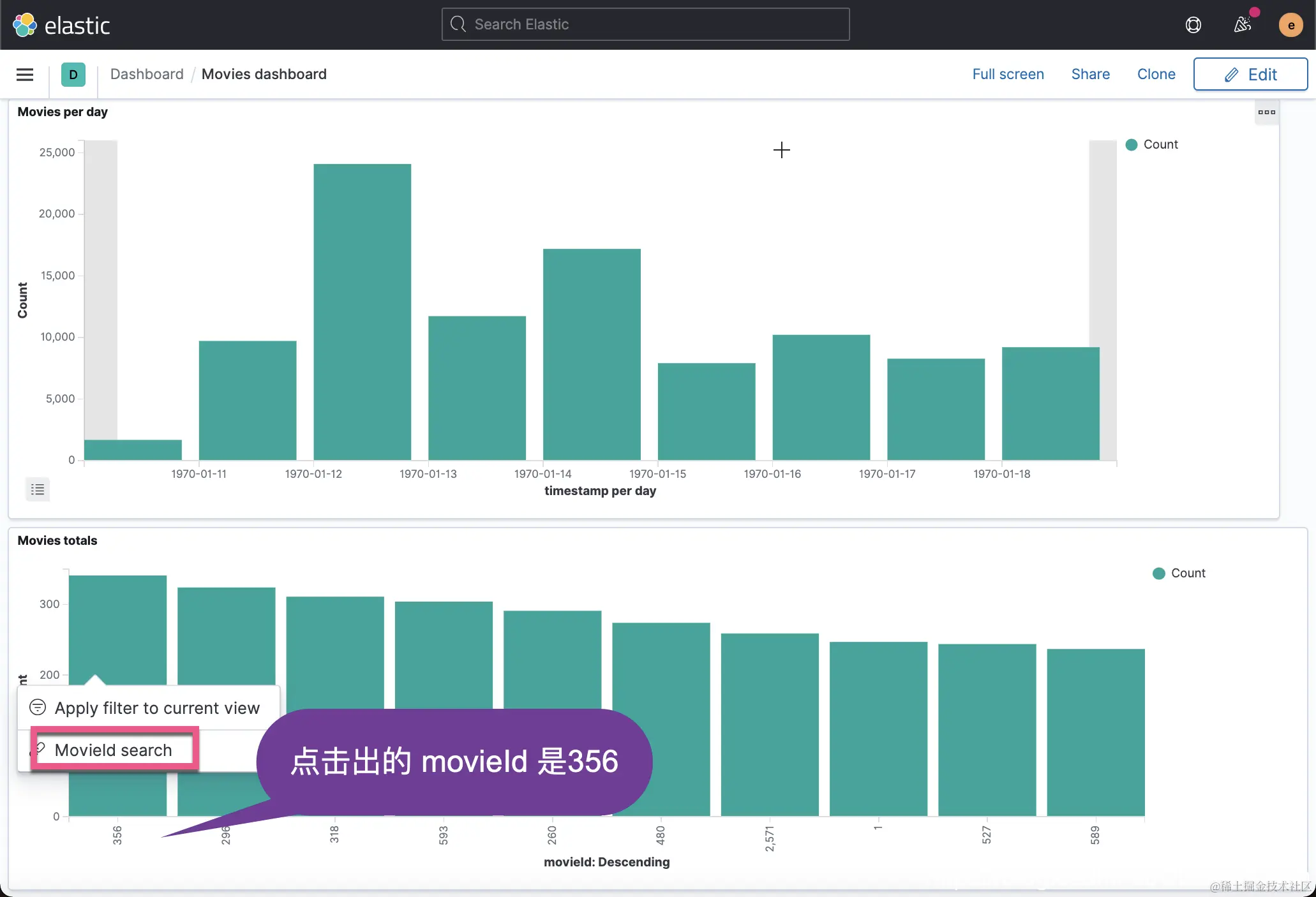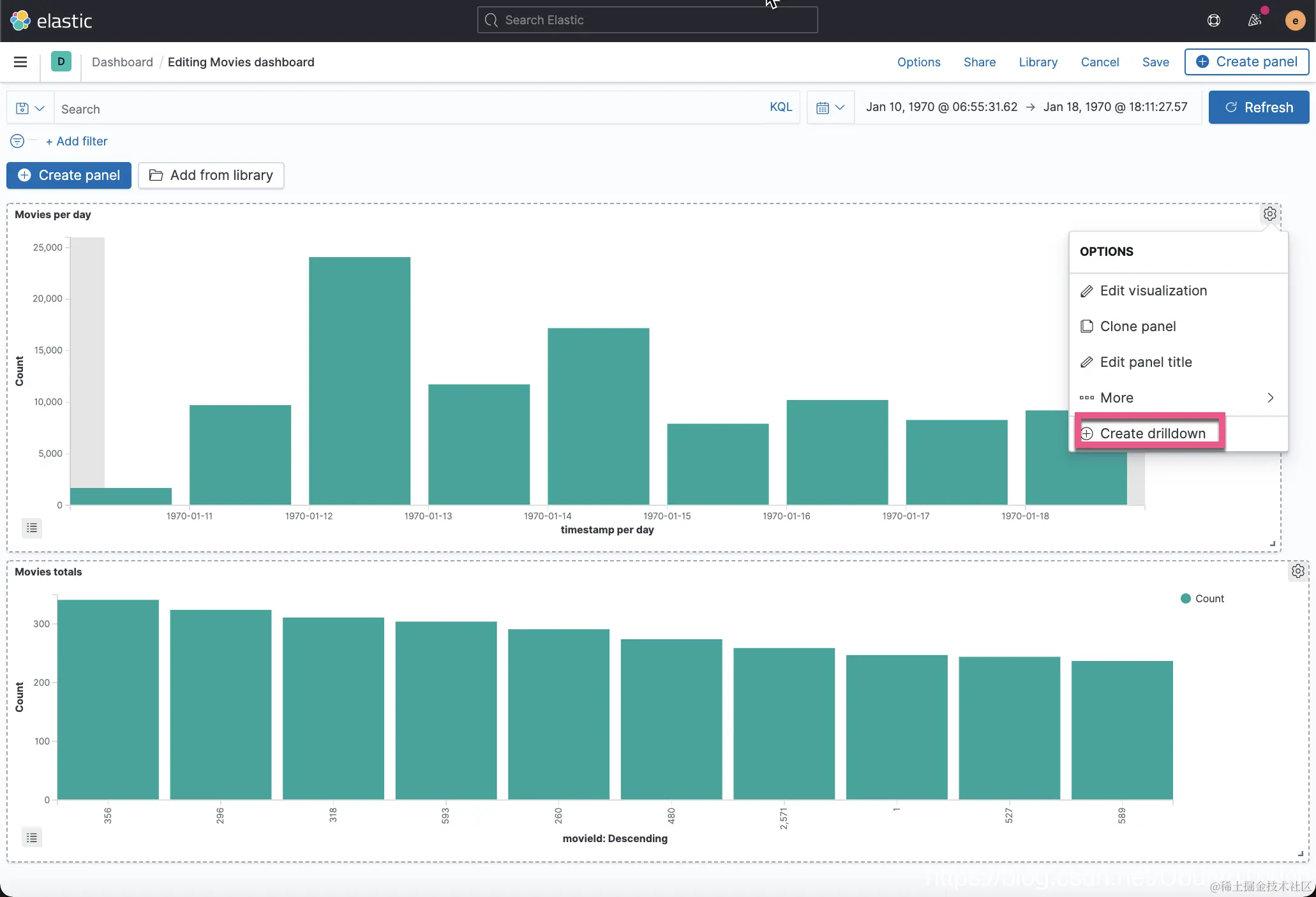 在很多的情况下,我们可能想要对 X 轴的内容进行 drilldown,那么我们该如何来实现呢?我们针对 Movies totals 可视化来创建一个 drilldown:
