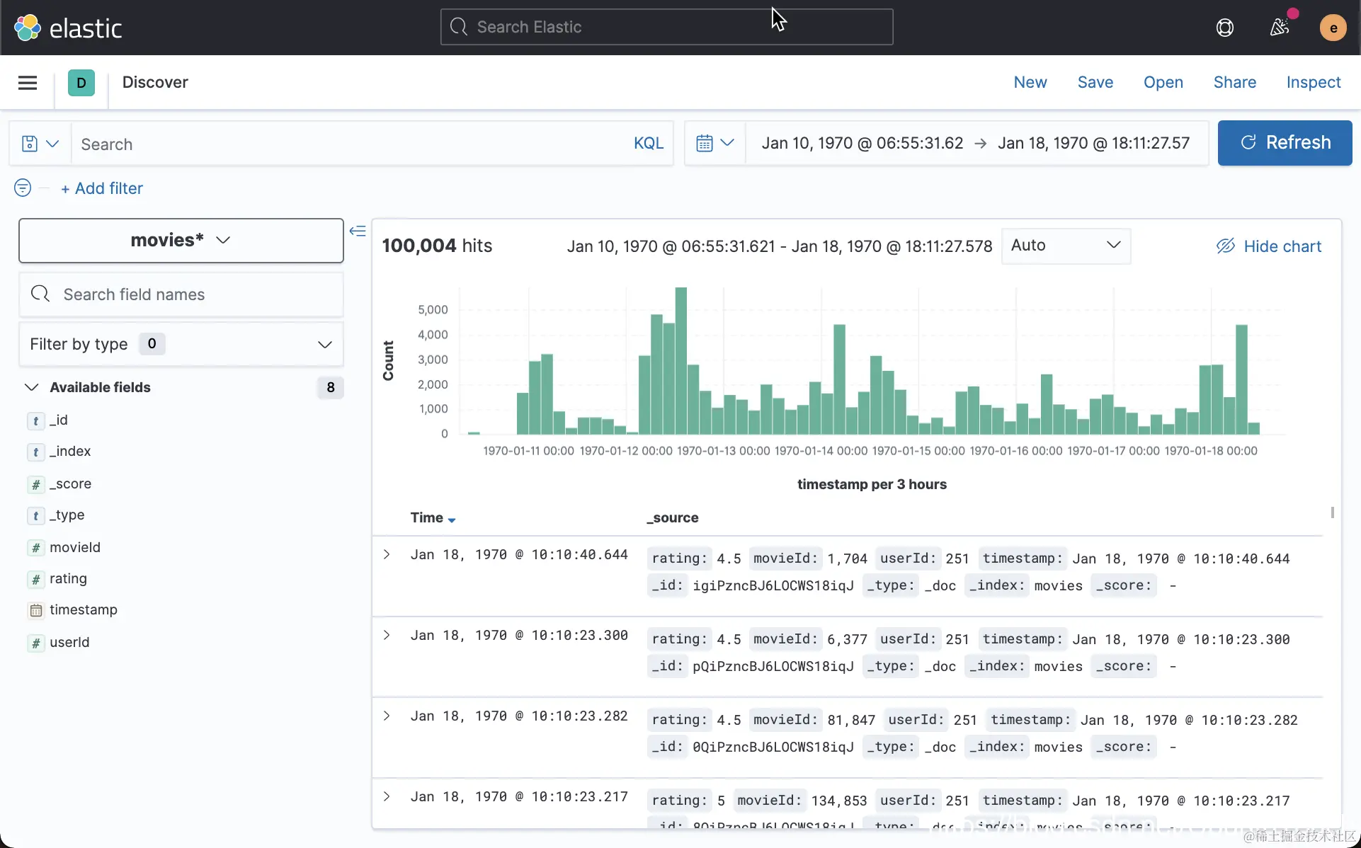 我们选择 timestamp 为 Time field。点击上面的 Create index pattern。这样我们就创建好了 movies index pattern。我们可以在 Discover 中看到导入的数据: