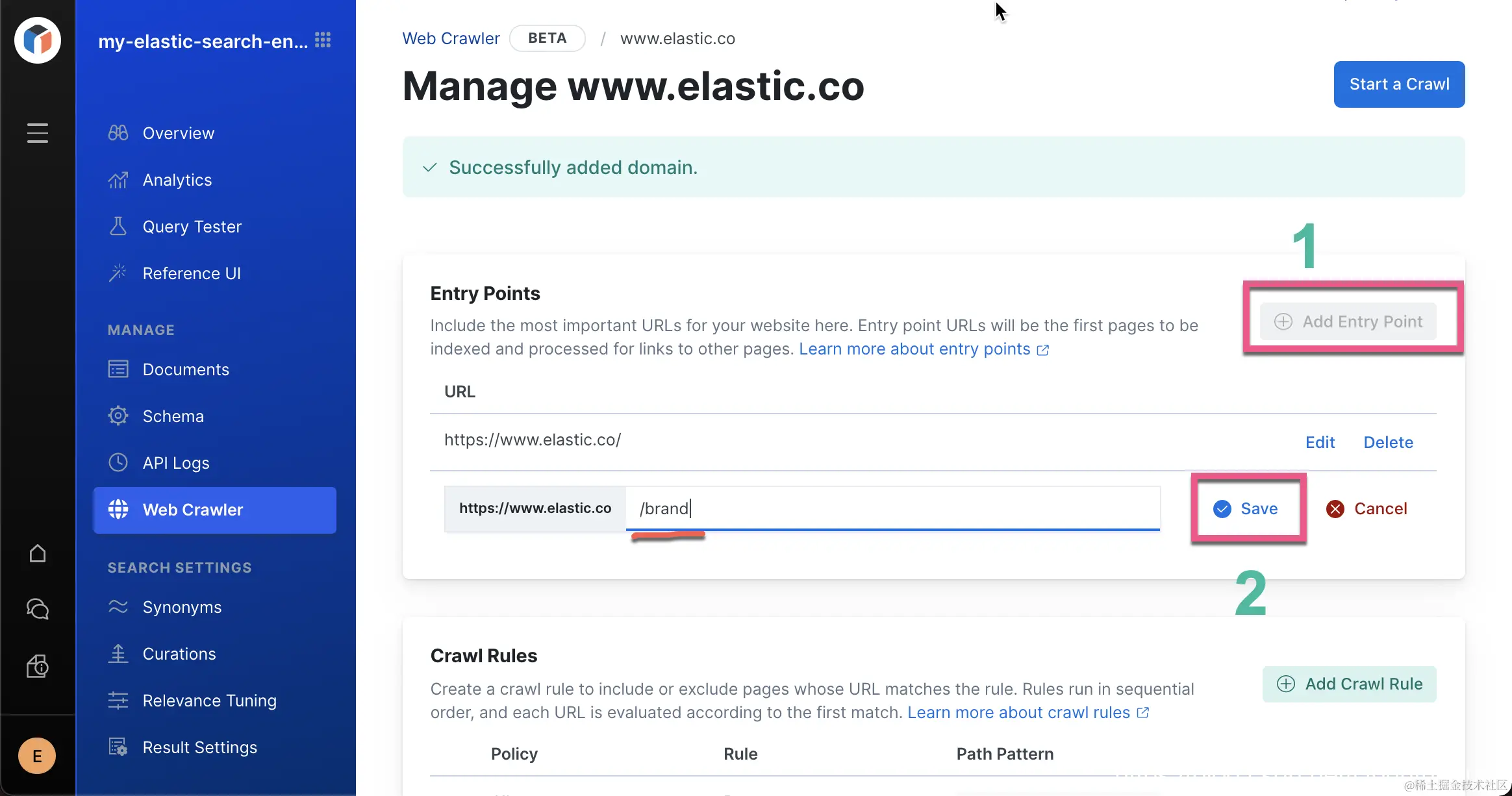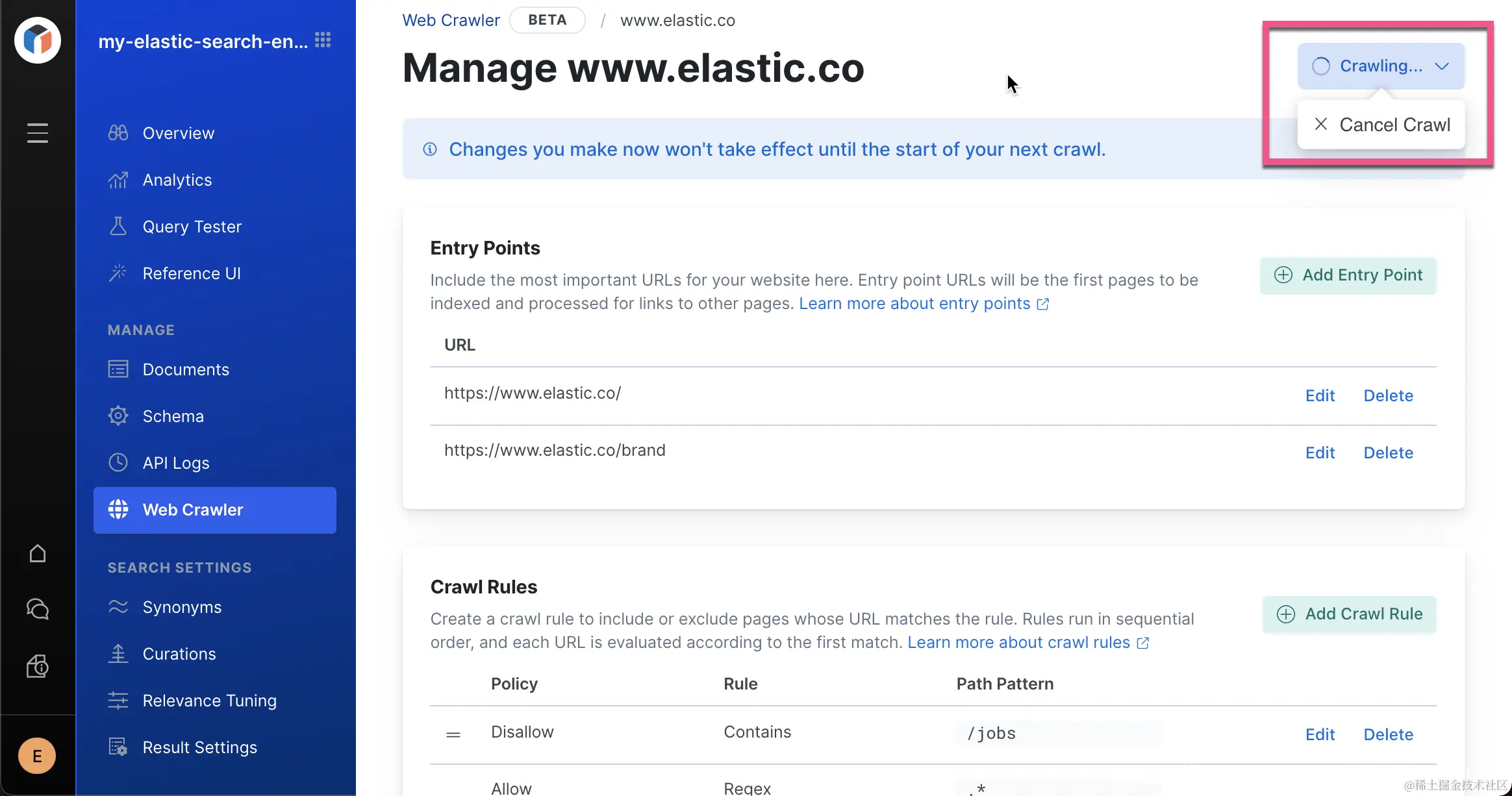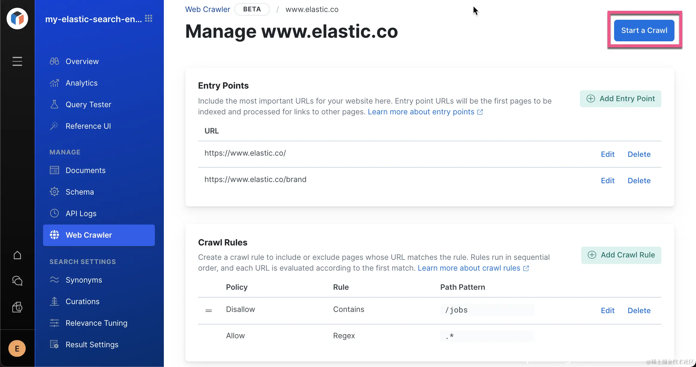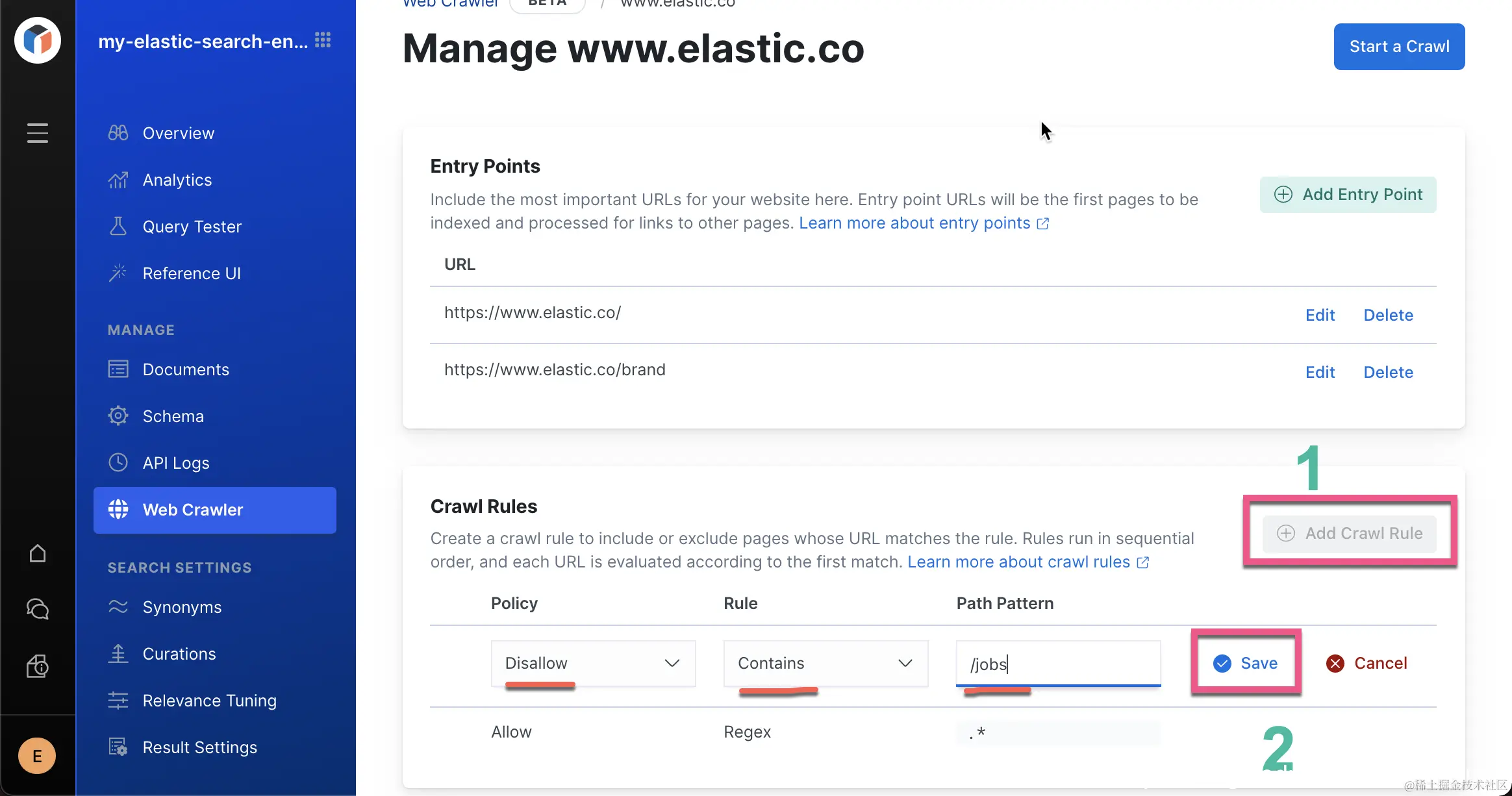 同时由于 www.elastic.co/jobs 不在首页被链接,我们单独为它添加了一个 entry point。由于一些考虑,我们也同时定制了一些爬虫规则。在上面,我们不希望爬 www.elastic.co/jobs 里的所有网页。