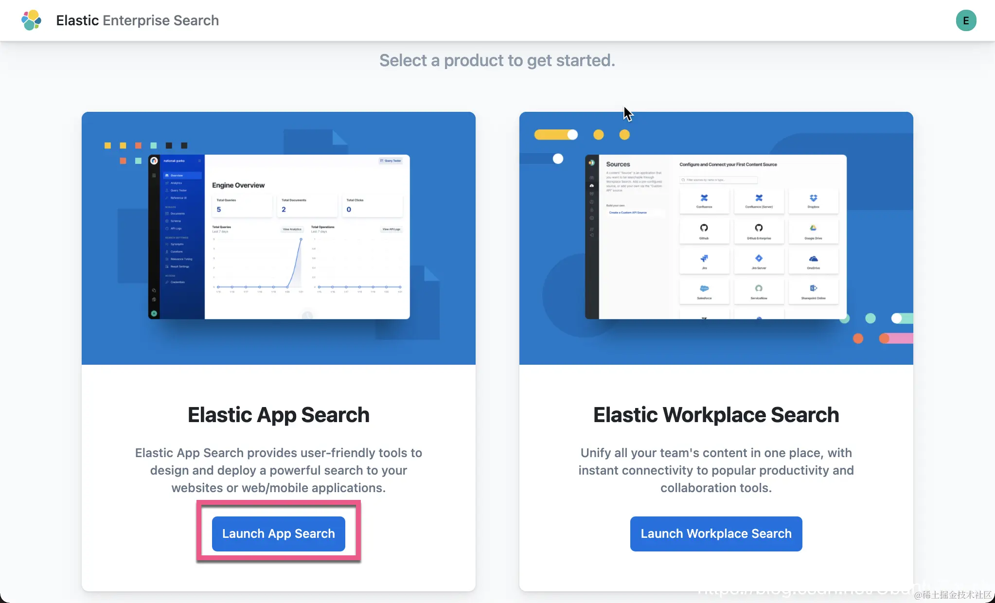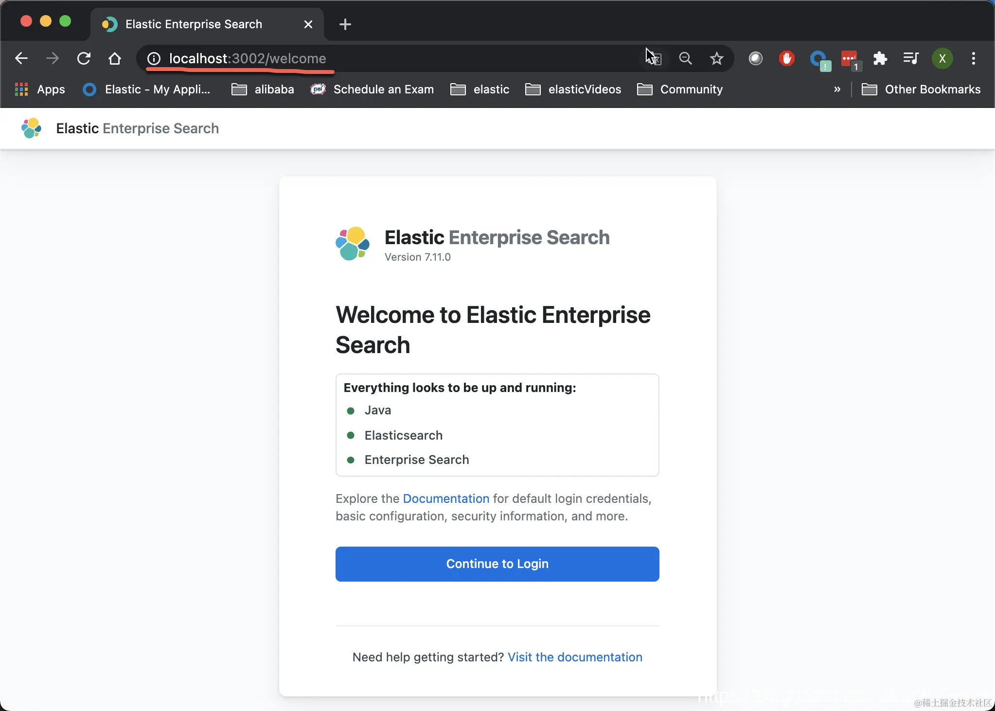 它表明我们的 enterprise-search 已经成功运行,并可以在端口地址 http://localhost:3002 进行访问。如果我们能够看到如下的画面,则表明我们的 enterprise search 的安装是成功的: