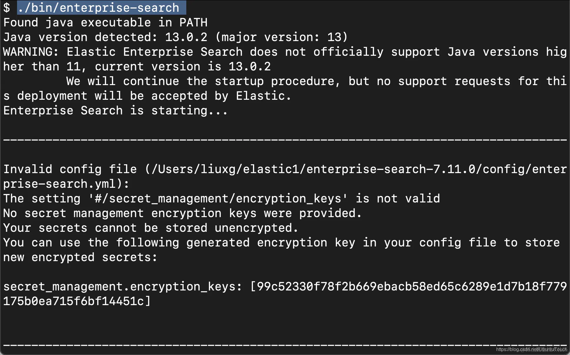 Invalid config file (/Users/liuxg/elastic1/enterprise-search-7.11.0/config/enterprise-search.yml):