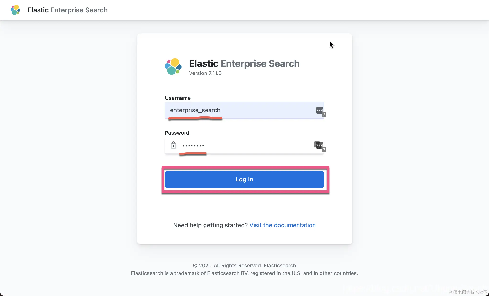 我们把之前设置的用户名及密码输入进去。针对我的配置:enterprise_search/password。点击 Log In 按钮: